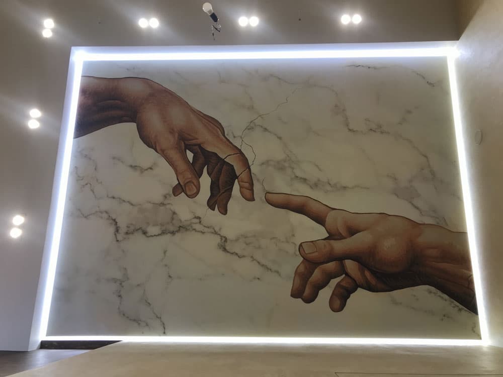 Установили двух-ярусный потолок, используя спайку полотен, свето-диодную ленту и фото-печать. Установили контурную линию и парящую линию, в мульти-цветах.