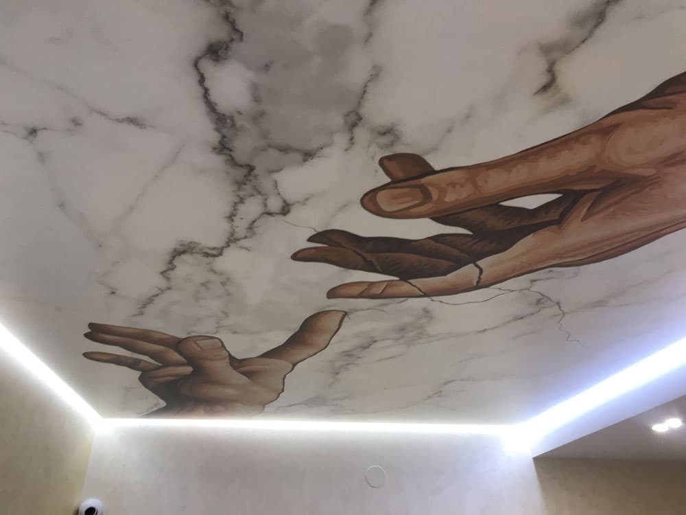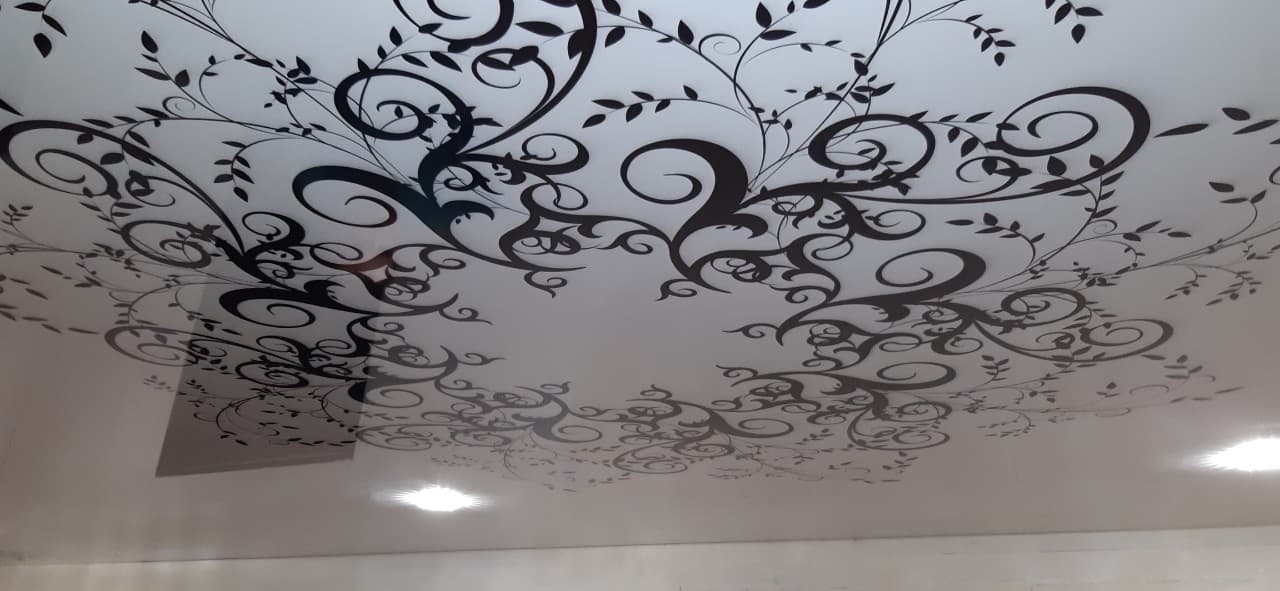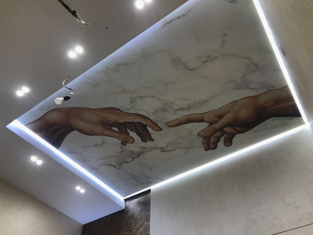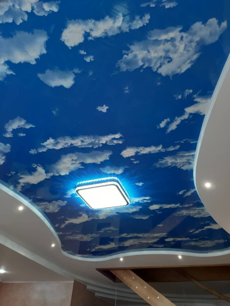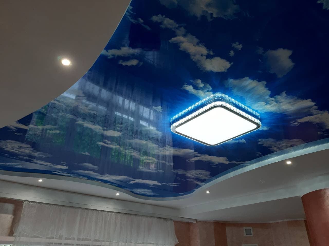 Установили отличный фигурный, двухуровневый потолок з арт-полотном.