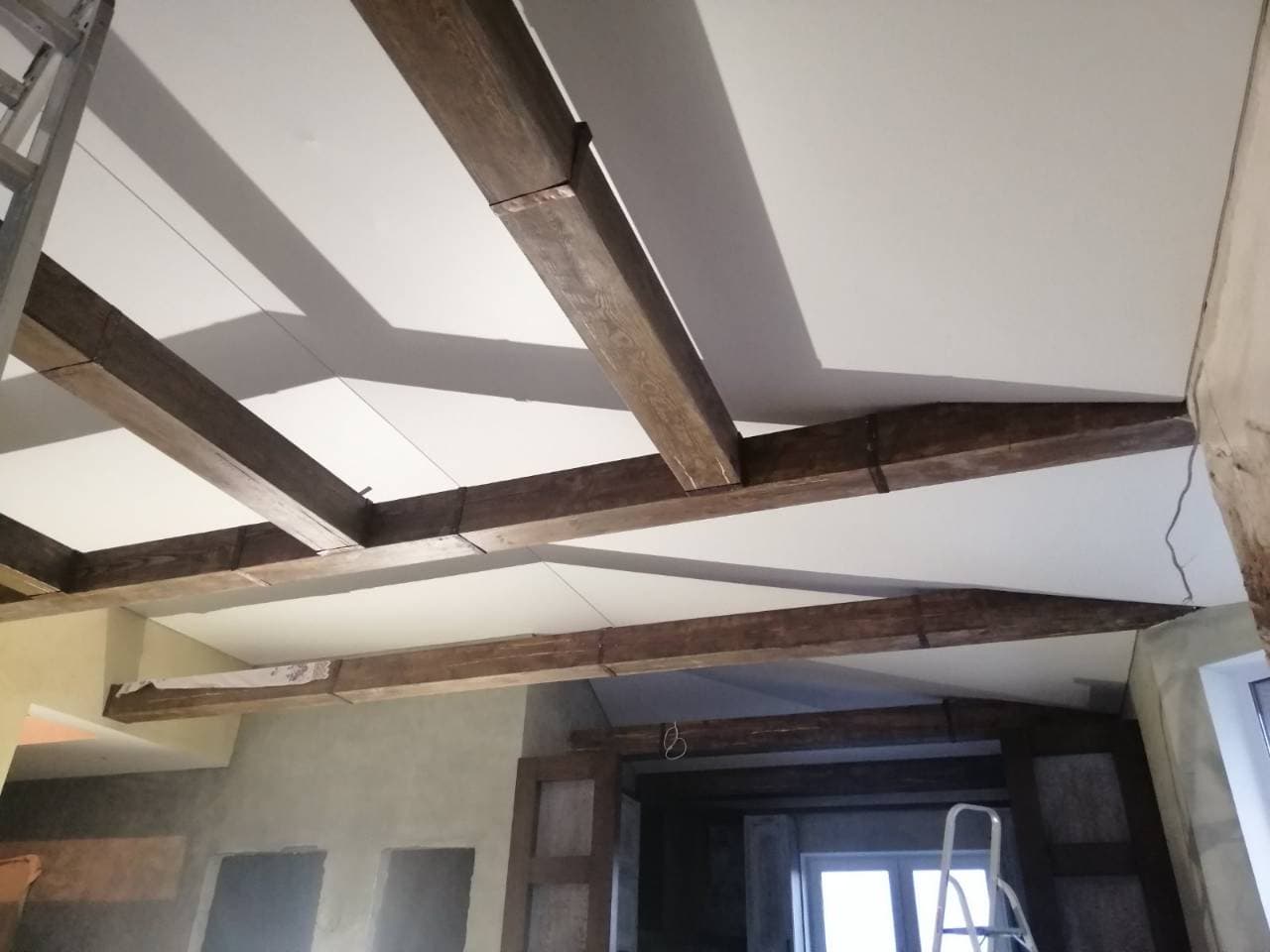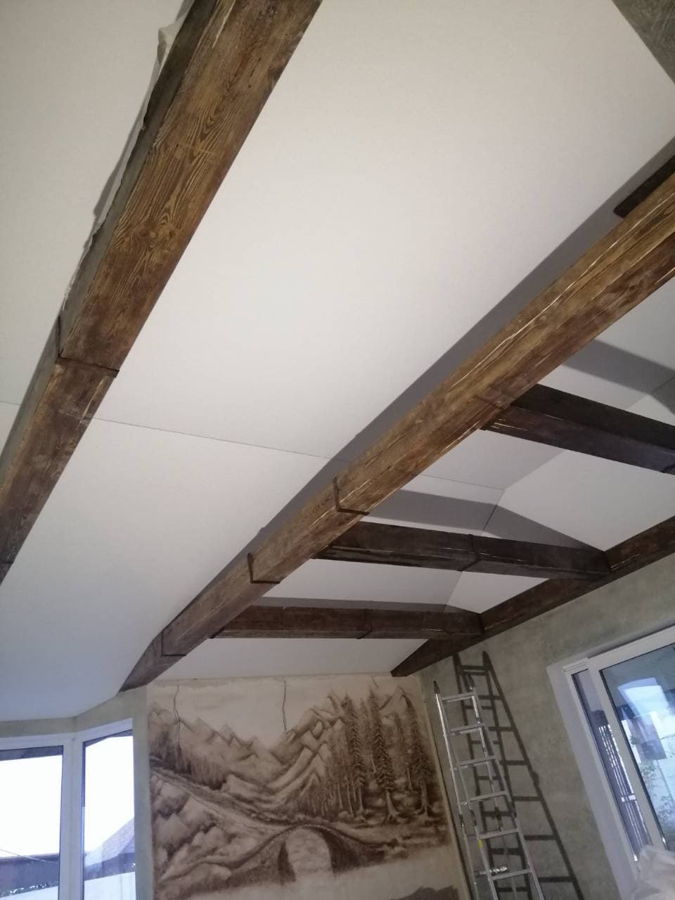 Полностью повторили геометрию потолка, обойдя при этом балки и используя более 4 разных видов профилей.