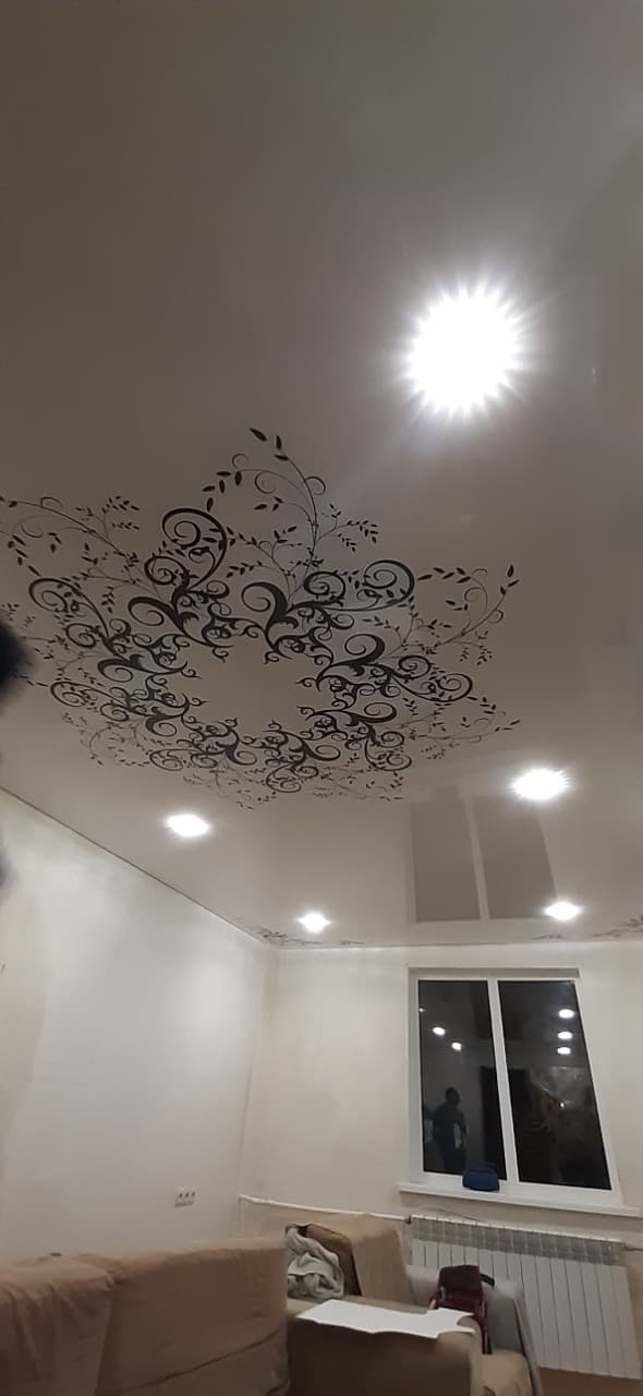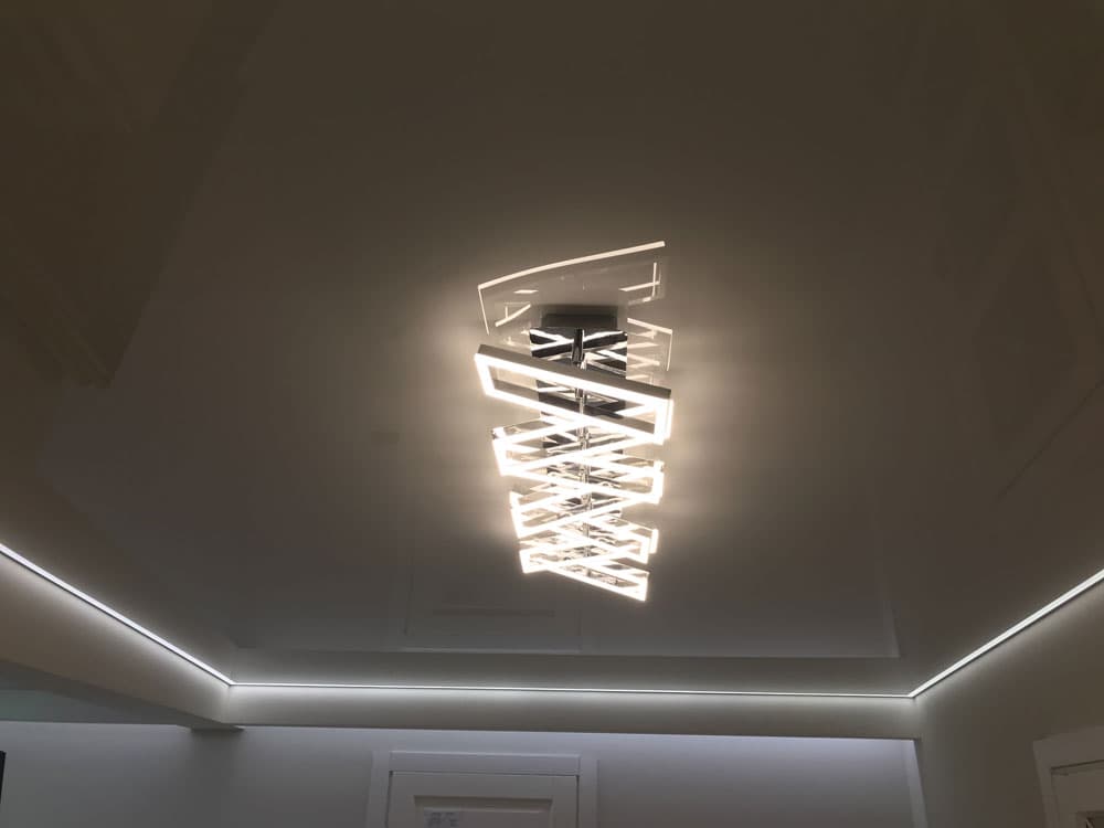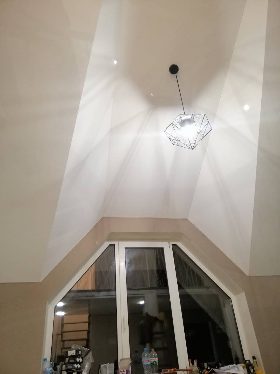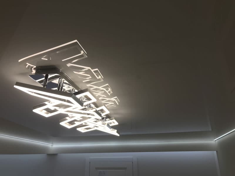 Подобрали глянцевую фактуру под дизайнерскую люстру, и установили натяжной потолок.