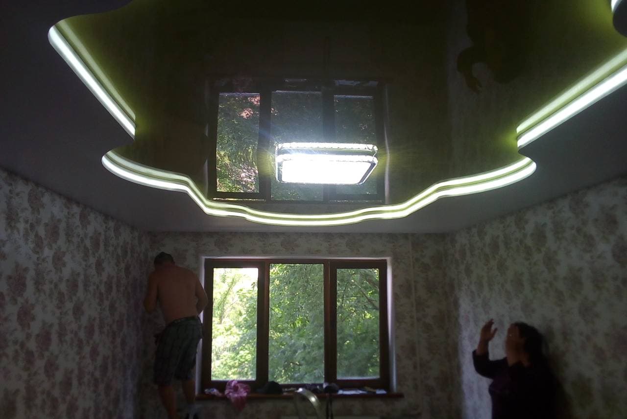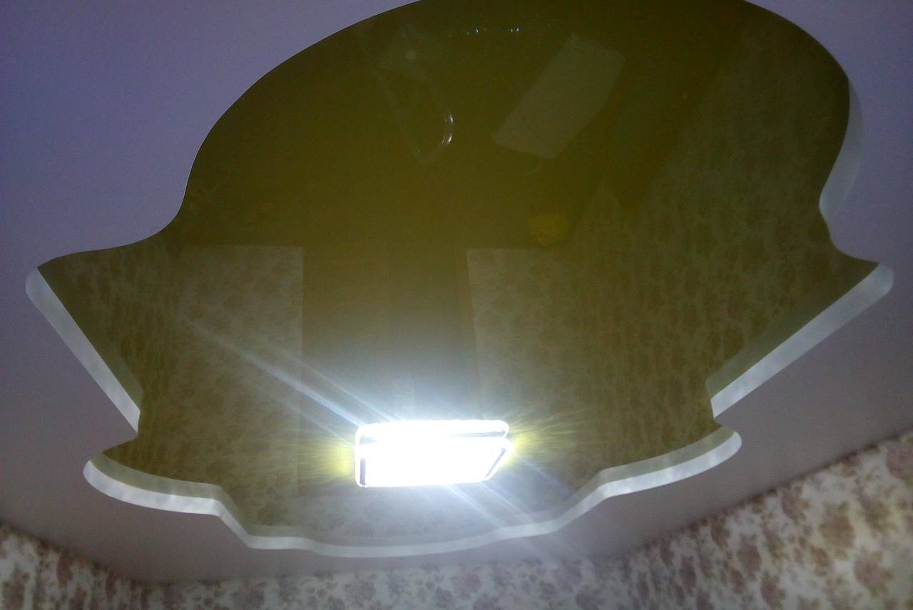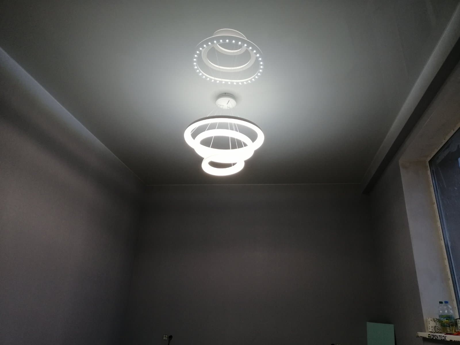 Подобрали глянцевую фактуру под дизайнерскую люстру, и установили натяжной потолок.