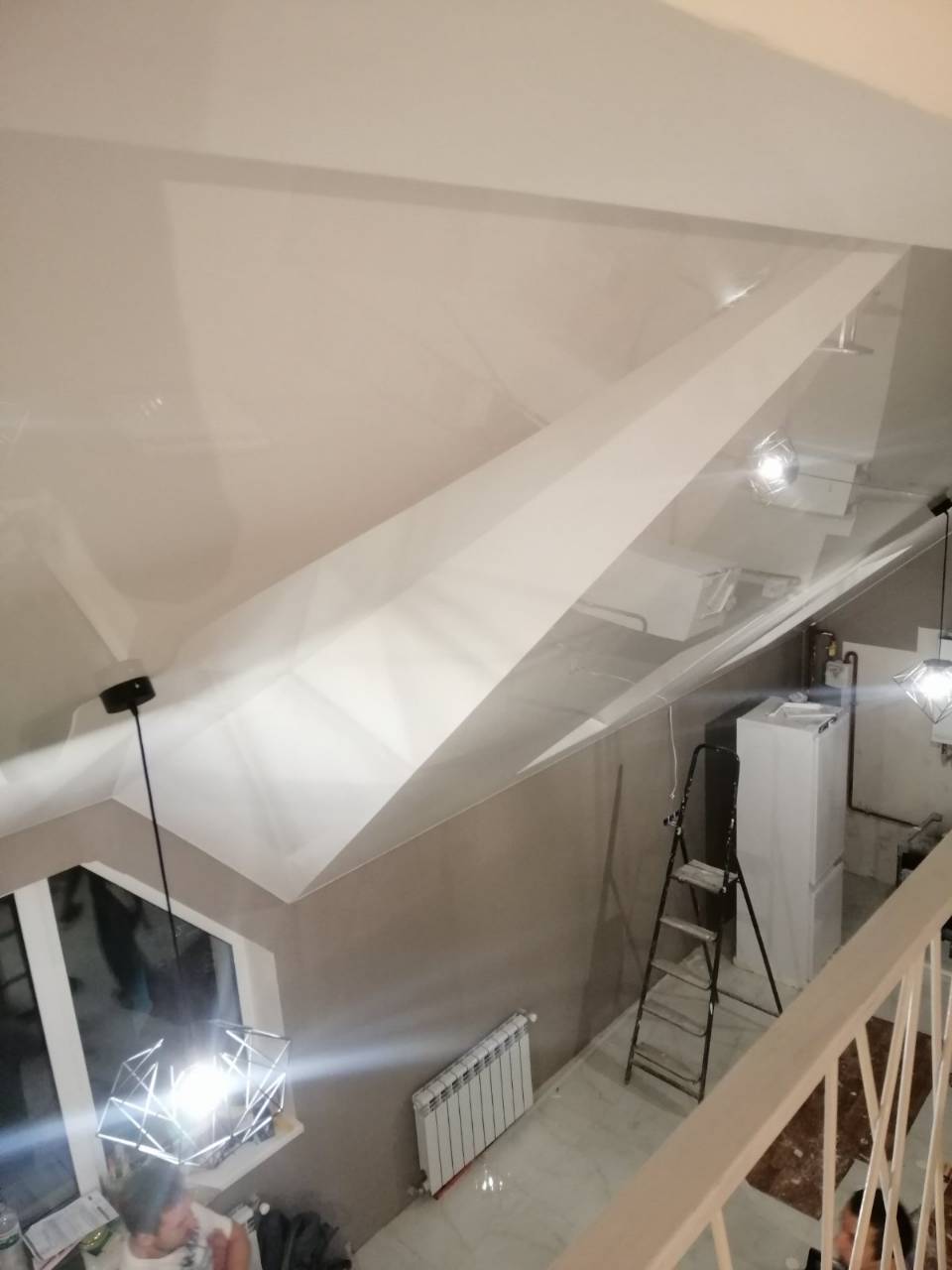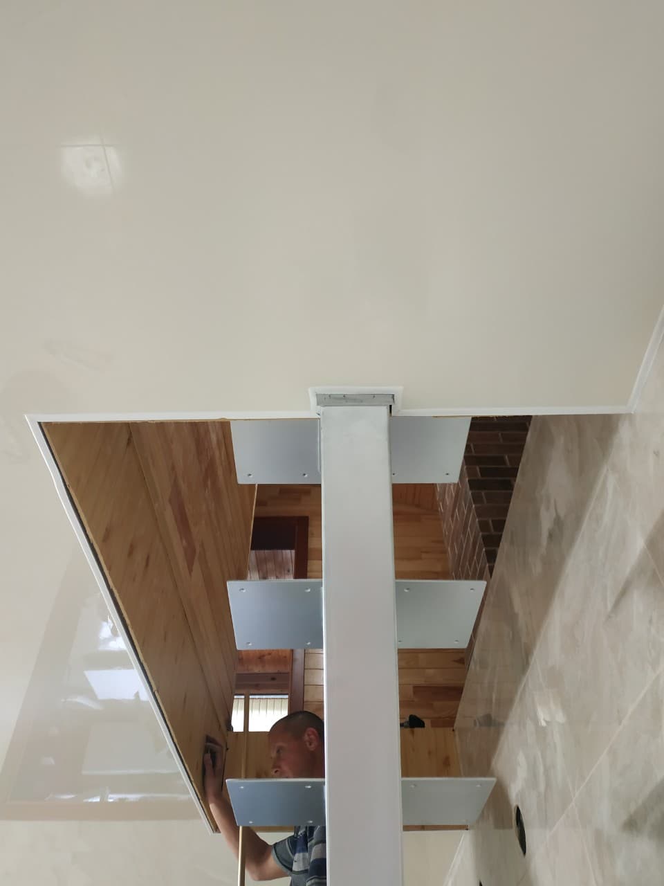Прямо на обьекте перекроили полотно, с учетом установленной клиентом лестницы. Не пришлось заказывать полотно по новым размерам. Сэкономили деньги заказчика.