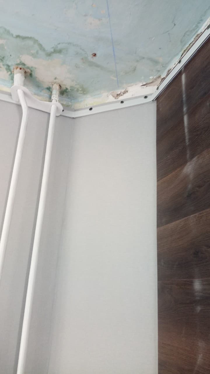 Обвели 2 трубы, скорректировали размеры полотна под угол прямо на месте, скрыли недостатки бетона под полотном.