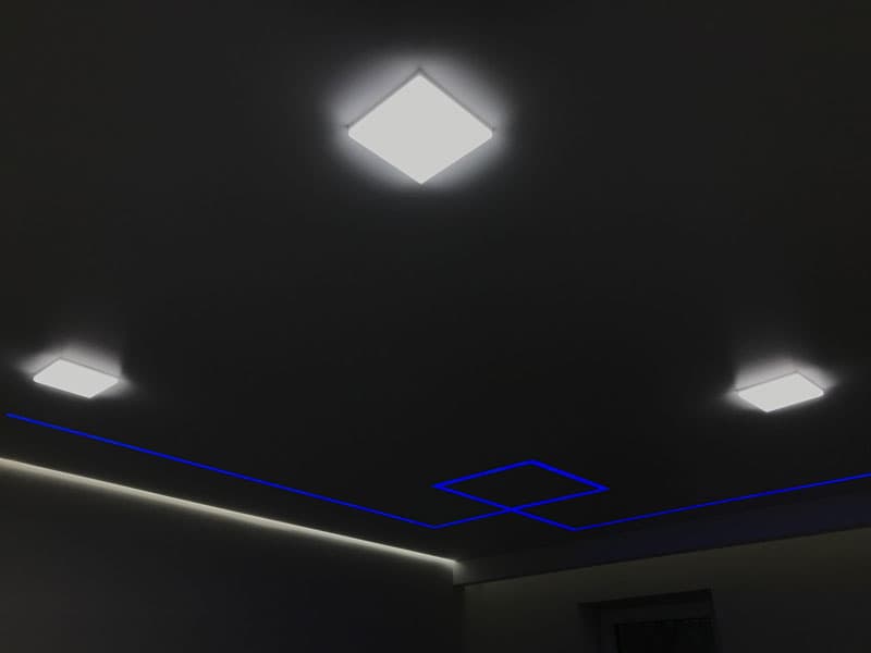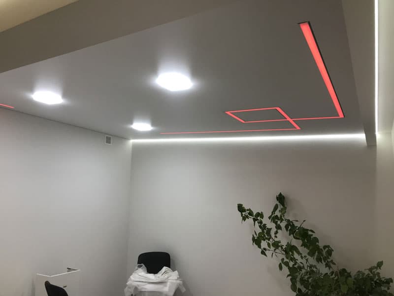 Изготовили специальную рамку для 16-цати квадратных светильников, установили потолочные профиля и, с помощью клин-гарпуна, сделали врез под светильники. Также установили сатиновое полотно на всем обьекте.