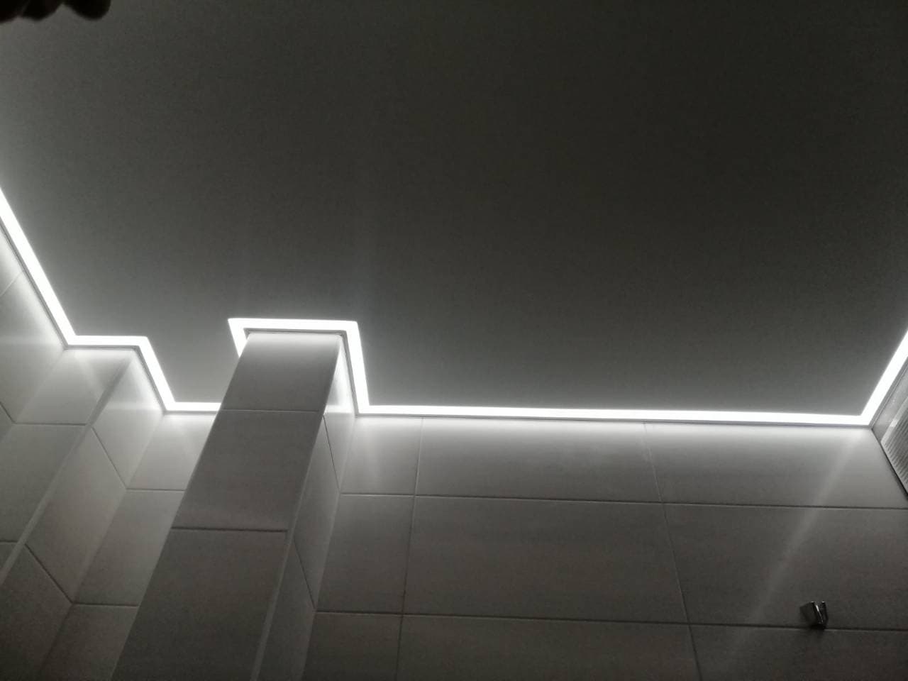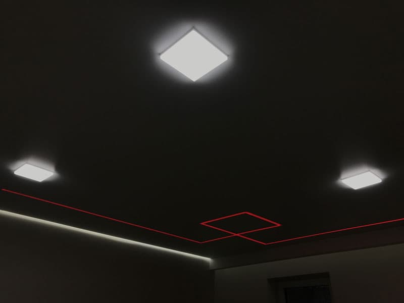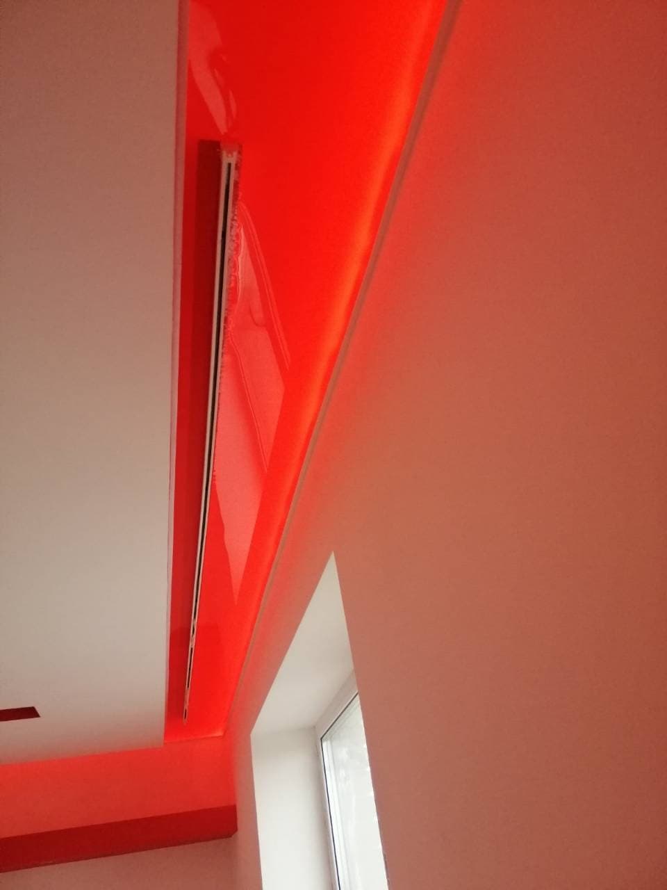 Установили красное, глянцевое полотно внутри ниши. Обошли нишу, которая не давала возможности легко установить потолок. Смонтировали белую свето-диодную ленту под полотном, по периметру.