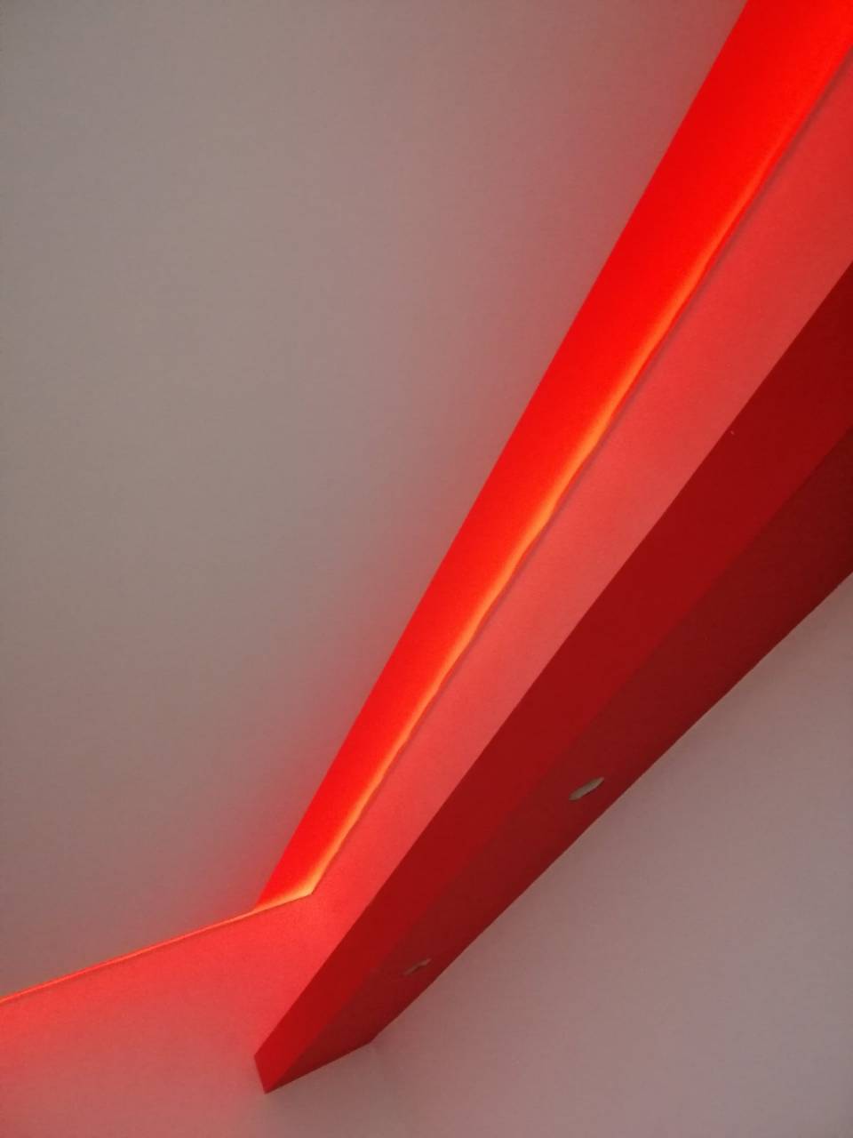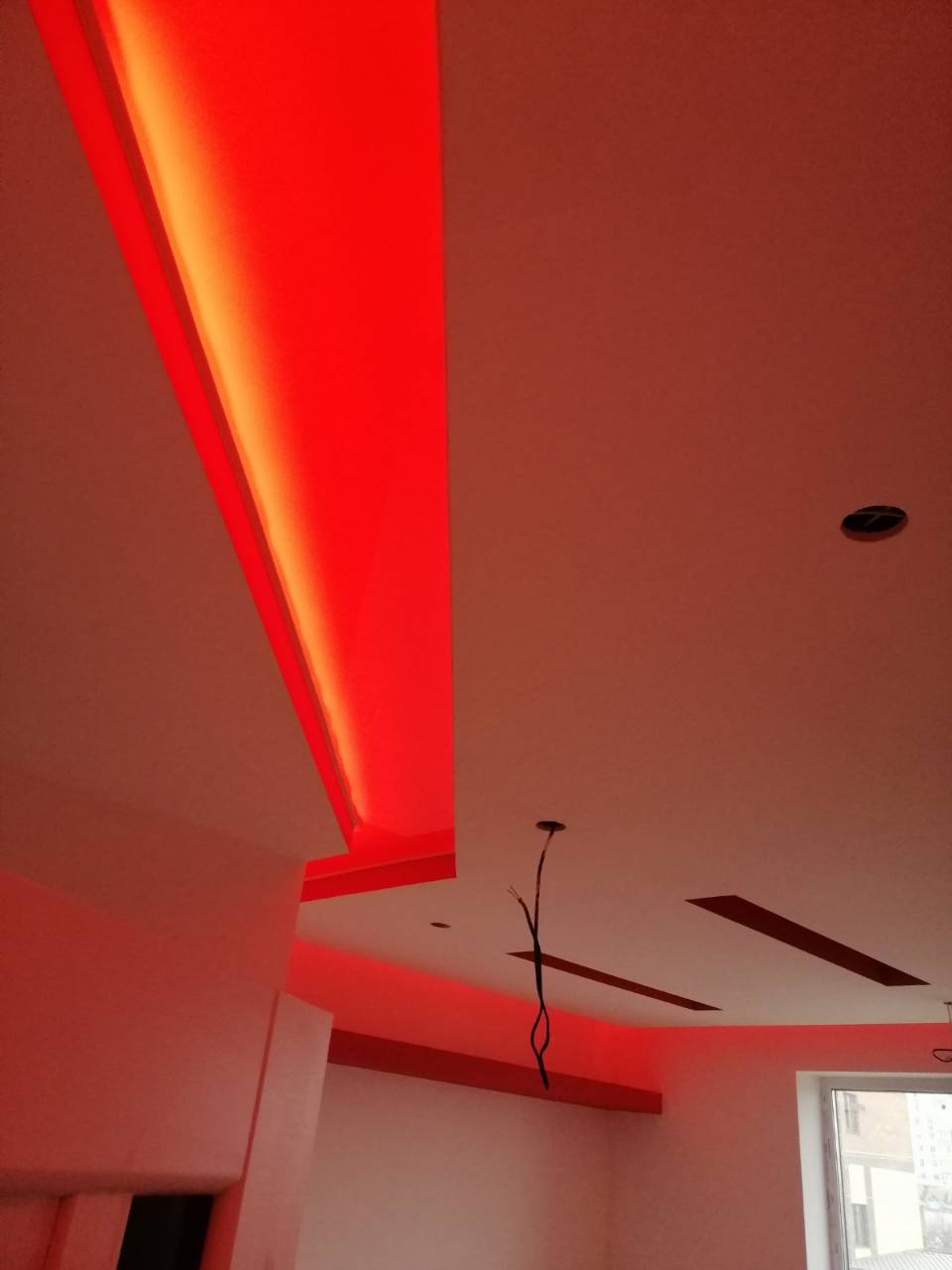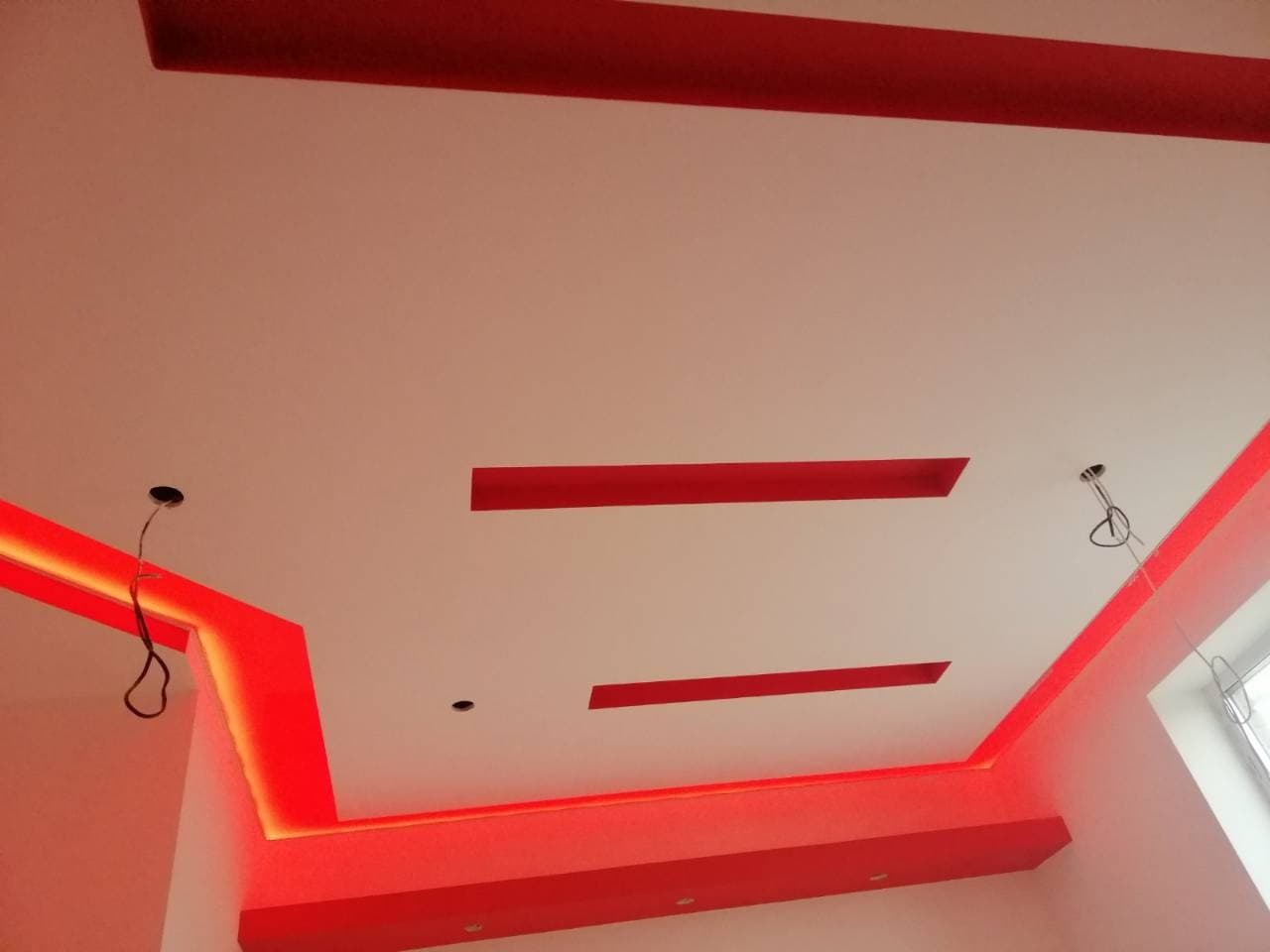 Установили красное, глянцевое полотно внутри ниши. Обошли нишу, которая не давала возможности легко установить потолок. Смонтировали белую свето-диодную ленту под полотном, по периметру.