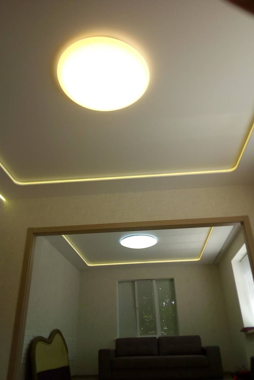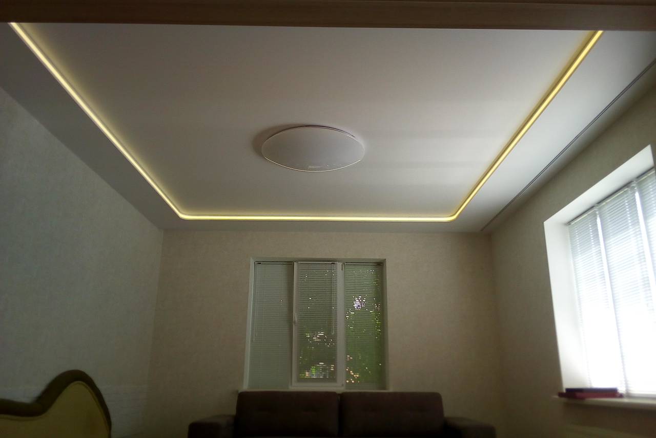 Установили профиль-гардину (потайной карниз), свето-диодную ленту на 2 двухярусных потолках.