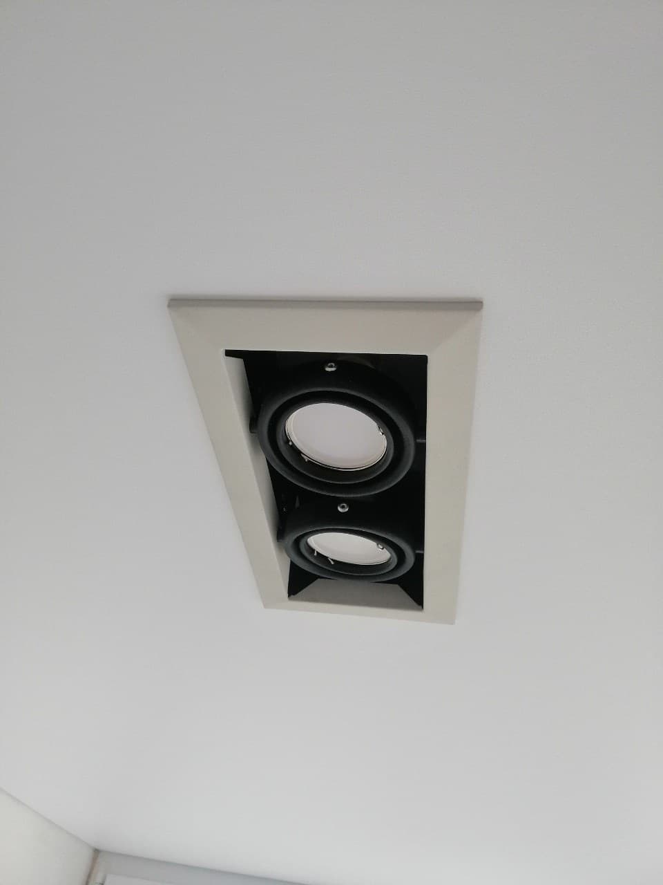 Полностью повторили геометрию потолка, используя более 4 видов профилей, установив светильники под углом. Сделали красиво и на совесть.